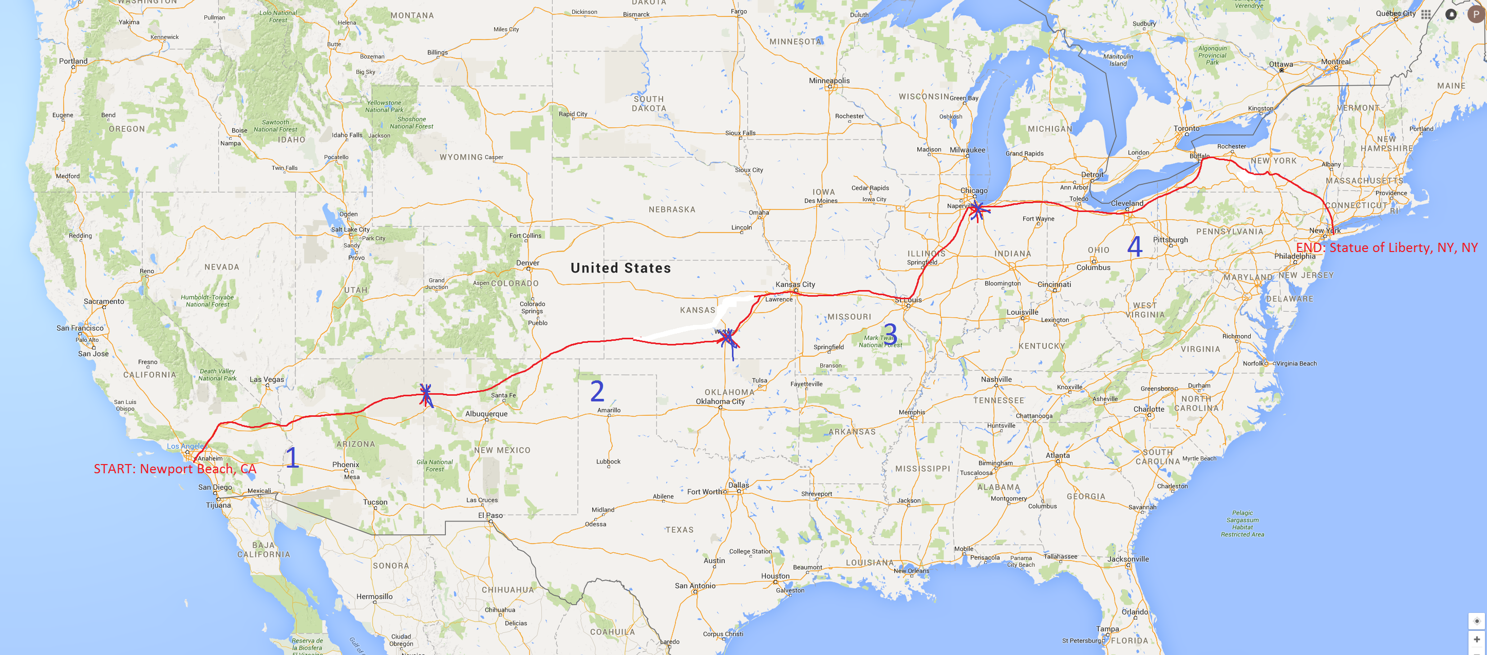 Since I live in California, the easiest option is just for me to go East. My endpoint is the Statue of Liberty in New York. Click on the thumbnail to see a rough estimate of my projected path. I’m sure things will change along the way and I want to post a more detailed map at a later date. I’m estimating my distance to be over 3, 000 miles and I’m expecting to be done well in advance of (assuming I make it all the way) the 8 month mark. I’ll be starting my journey on January 2nd, 2016.